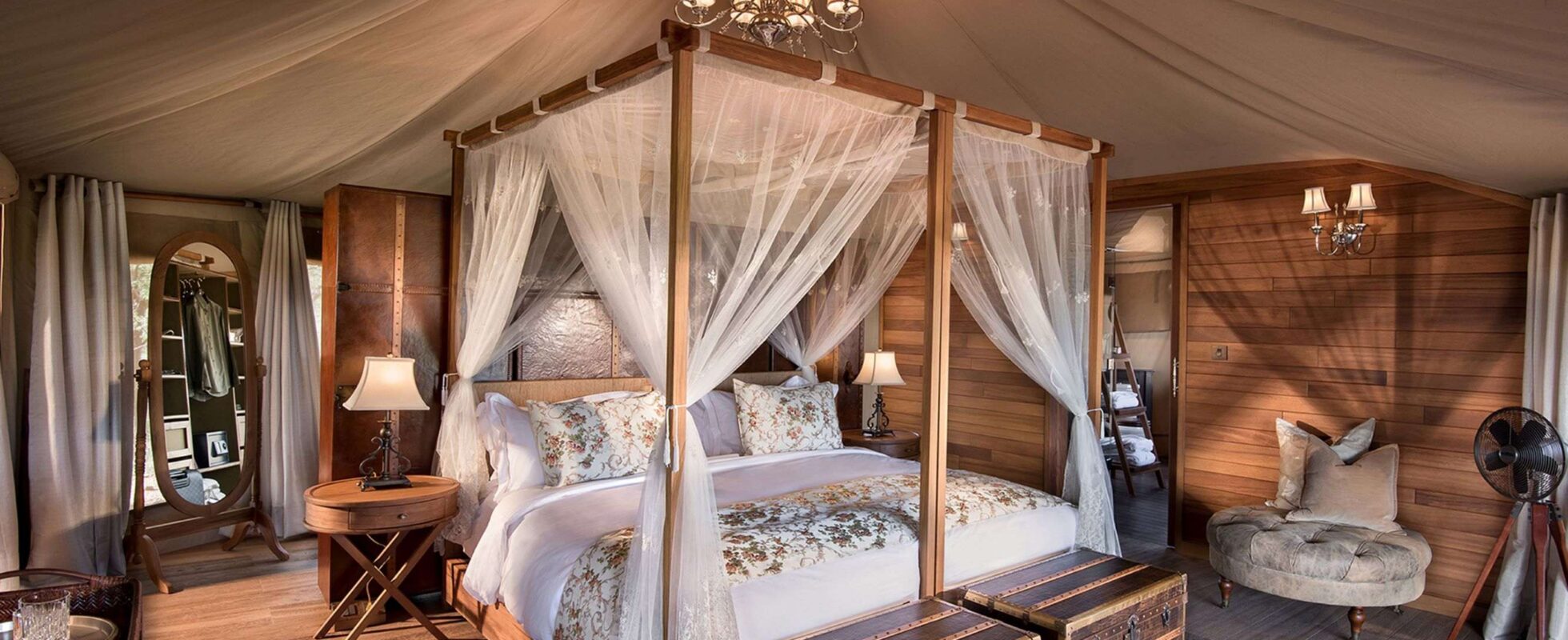 The tented camp of One Nature Nyaruswiga in Serengeti National Park will leave you wanting nothing more. The tents are beautiful and very spacious, with lush furniture in a classic style, beautiful bathrooms and outside showers. The comfy big sofas, the fourposter beds filled with pillows, the wood fire inside the tent, the classic bathtub openly in the bedroom next to that fire… it all speaks of a luxury that you will rarely find somewhere else. The camp has 12 tents designed for 2 -3 guests and 2 family tents for up to 6 sleeping guests. Besides, it boasts a lush lounge area, a restaurant with white linen, beautiful china, crystal glasses and silver chandeliers, and an infinity pool with a jacuzzi. On top of that, there is an astral observation deck where you can have your dinner with the telescope right next to you for your stargazing.
