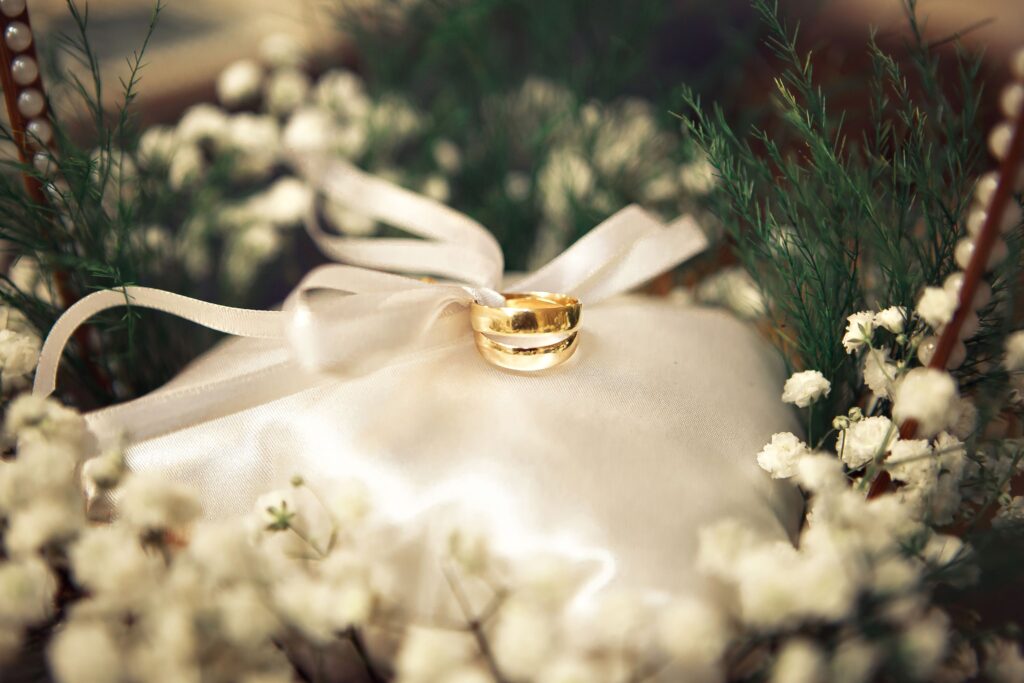The ceremony begins with a procession, as the bride and groom are accompanied by friends and family to the wedding venue. Once settled, the officiant guides the couple through the rituals, which always include an exchange of vows.