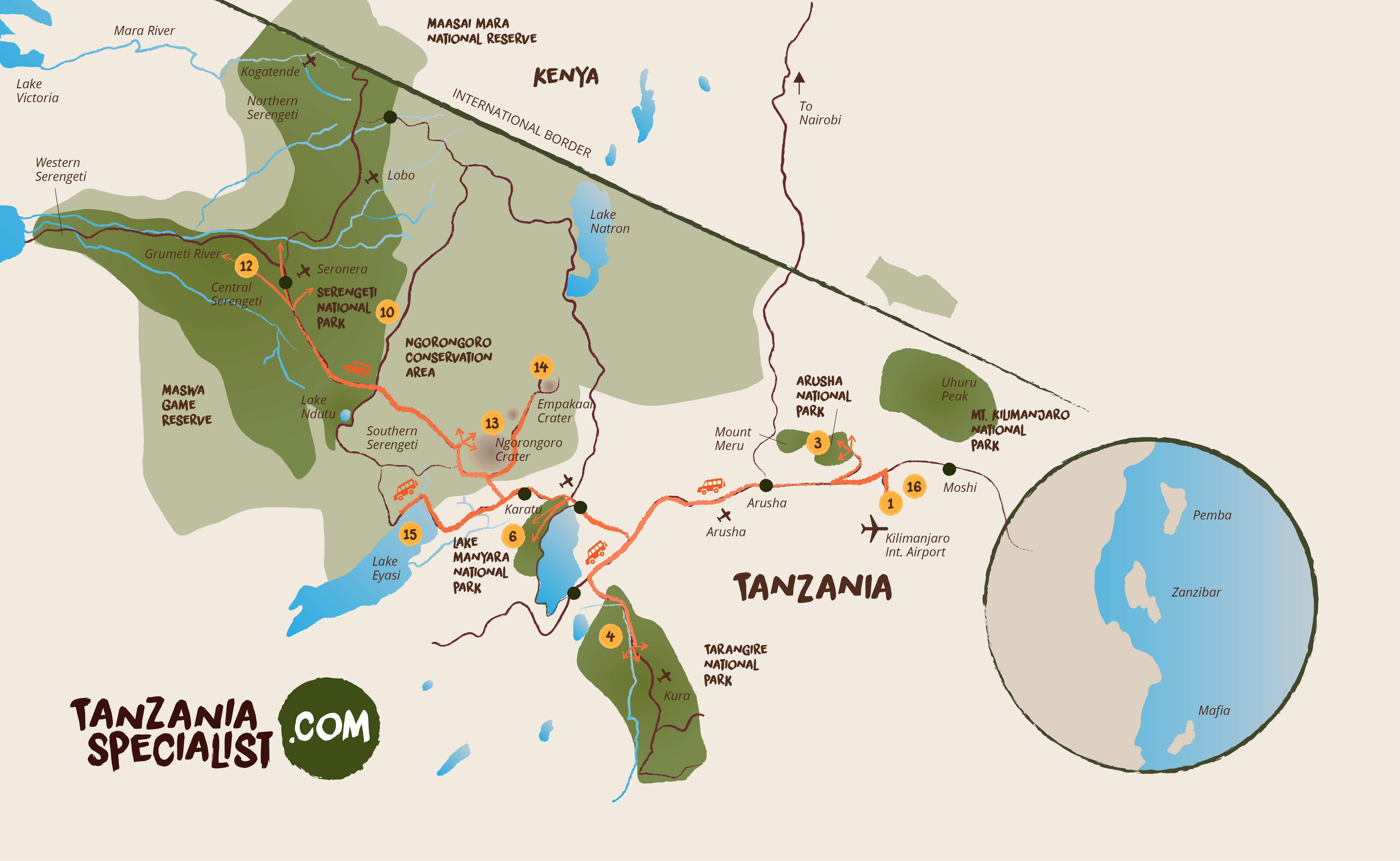Is making choices not your thing, and you have plenty of time anyway? Then this route is for you, as it beautifully combines everything you would want from a safari in Tanzania. This 16-day safari is probably the best you can find, if you want to explore the northern parks of Tanzania!
